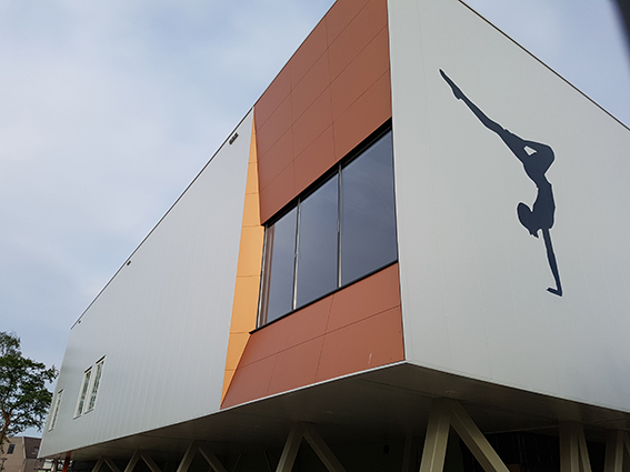 Ik moest er erg aan wennen. Het uitzicht werd langzaam beter toen er wat kleurtjes kwamen en er een levensgroot turnend meisje op de gevel werd geplakt. In Grave mopperen ze als ze in een weiland een parkeerterrein willen aanleggen; in Boxmeer kun je gewoon bouwen wat je wilt.