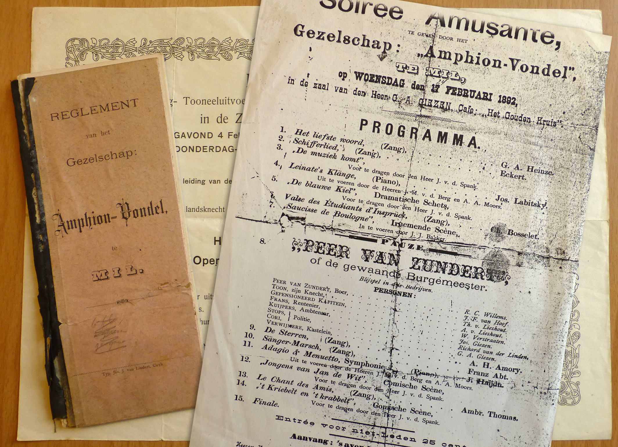 BIJSCHRIFT: Het reglement van Amphion-Vondel en een affiche van een uitvoering in 1892. Foto: Geurt Franzen