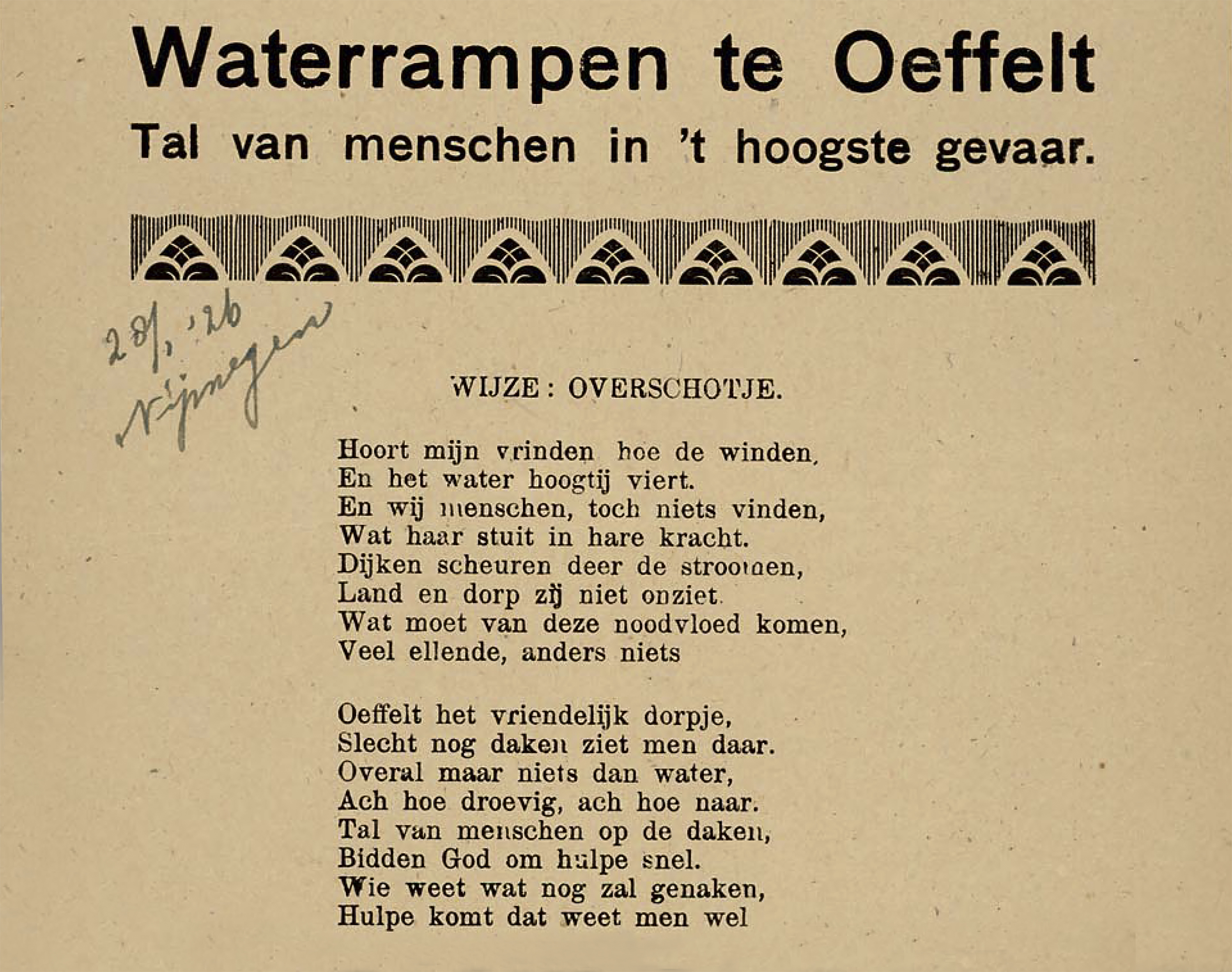 Een bijzonder documentje, dat in druk verschenen straatlied over Oeffelt dat in het Meertens Instituut in Amsterdam wordt bewaard. Met potlood heeft een onbekende op het blad een datum en een plaats genoteerd: ‘28 januari 1926, Nijmegen’. Waarschijnlijk is het drukwerkje rond die tijd in de stad verspreid.