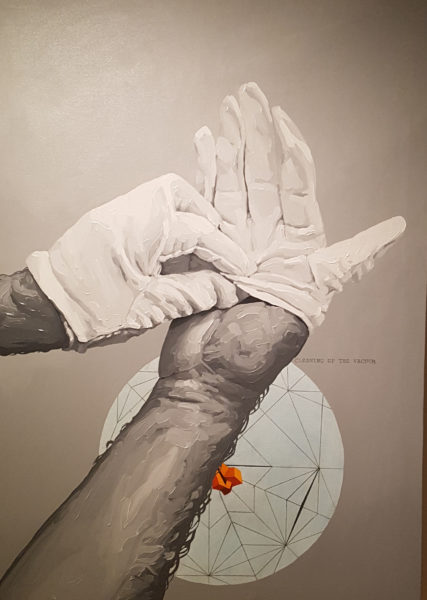 Wat krijgen we te zien in de eigenwijs vormgegeven tentoonstelling ‘Wait’ in het Portugese museum? Dit bijvoorbeeld: een schilderij van António Olaio, getiteld Cleaning Up the Vacuum #2. Een chirurg, die, zo mogen we aannemen, zijn handen grondig heeft gewassen, rolt de operatiehandschoenen uit over zijn vingers. Olaio trekt je meteen de operatiekamer in. Buiten beeld ligt een man of vrouw, misschien ben jij het wel, onder narcose te wachten op wat komen gaat. Je voelt de spanning die ongetwijfeld ook door het lichaam van de chirurg siddert, ziet het in de zorgvuldigheid waarmee zijn linkerhand de handschoen over de rechterhand schuift.
