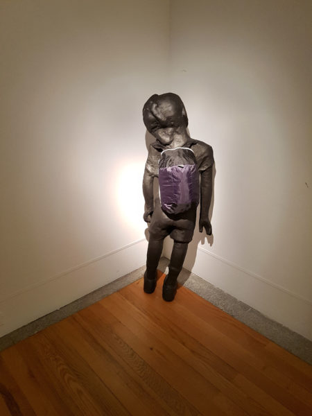 Een heel andere perceptie van tijd geeft een bronzen beeldje in een hoek van een zaal. João Ferro Martins fabriceerde het mannetje met de schoolse rugtas om zijn schouders. In het gebogen hoofd herkennen we de leerling die zich ervan bewust is dat hij iets fout heeft gedaan, die de straf van de meester, een uur in de hoek, gedwee ondergaat. Je hoeft het in je schooltijd niet aan den lijve te hebben ondervonden om te weten hoe dat voelt, dat eindeloze zinloze wachten in die hoek, helemaal alleen met je gedachten van wroeging en schuld. Misschien hoor je de secondewijzer van de schoolklok wel tikken…