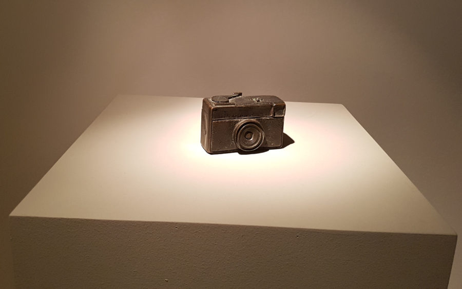 Het is moeilijk voor te stellen, in een tijd waarin een foto in een fractie van een seconde nadat ie gemaakt is, op het scherm van je mobieltje te zien is, maar niet zo heel lang geleden deed fotograferen een aanslag op je geduld. Wie niet kon wachten, hield zich er verre van. Eerst moest dat rolletje vol. Die 24 of 36 opnamen schoot je niet willekeurig. Zo’n filmrolletje kostte geld en het ontwikkelen en afdrukken ook. Had je eindelijk die 36 hopelijk perfecte opnamen gemaakt, dan begon het wachten. Rolletje naar de fotozaak en pas drie dagen later vol spanning kon je terug naar de toonbank waar het envelopje werd opengemaakt en de zorgvuldig geschoten kiekjes zich eindelijk lieten bewonderen. Twee onderbelicht, een derde óver en bij nog eens drie had de geportretteerde de ogen dicht… João Ferro Martins bronzen object, een Agfamatic 55c, brengt die geduld eisende hobby van toen in al zijn simpelheid weer terug.