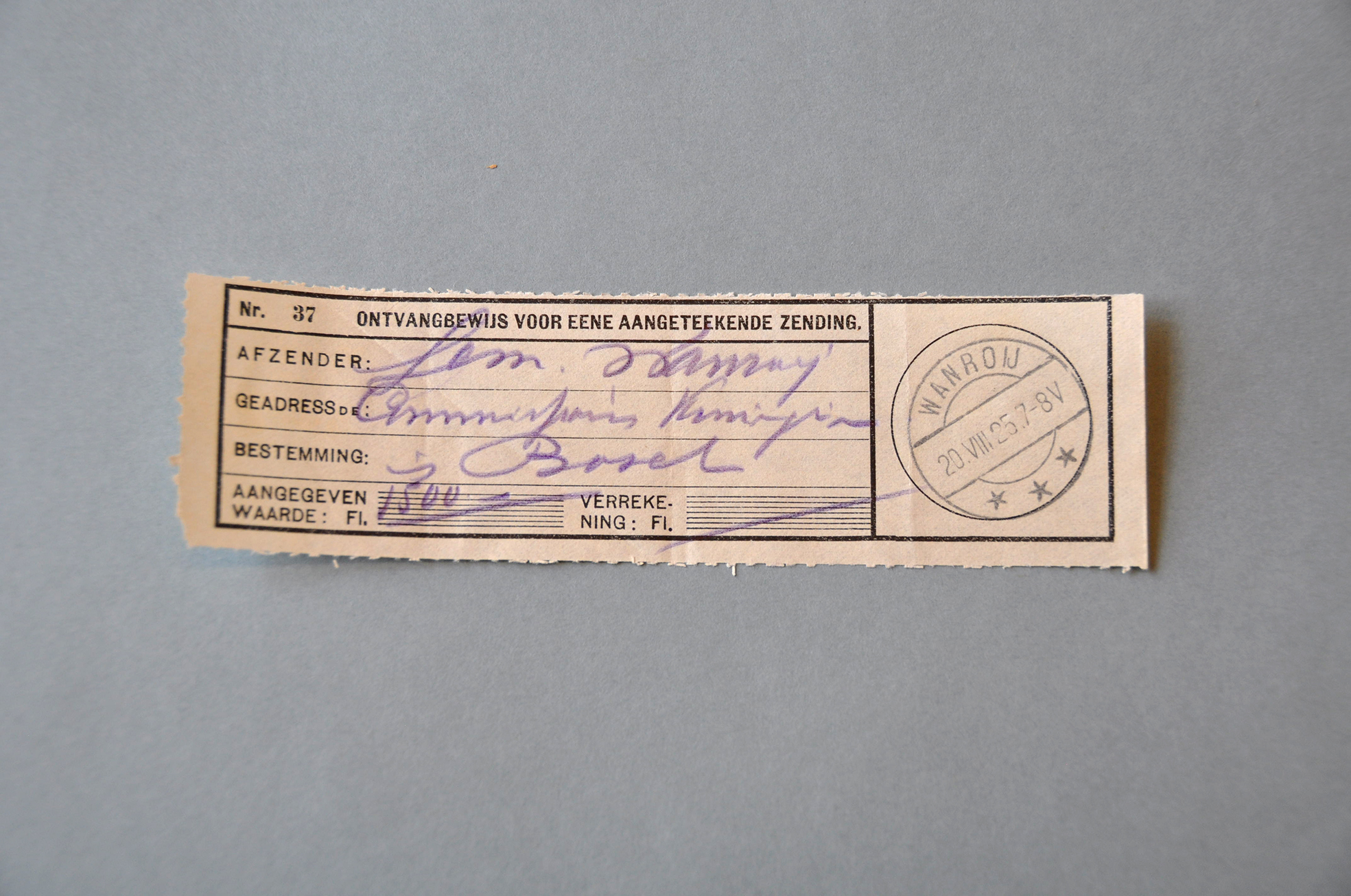 Het betalingsbewijs van de 1.500 gulden die zijn overgemaakt van de gemeente Wanroij naar het noodfonds voor Langenboom, dat wordt bewaard bij het BHIC in Den Bosch. Foto: Geurt Franzen