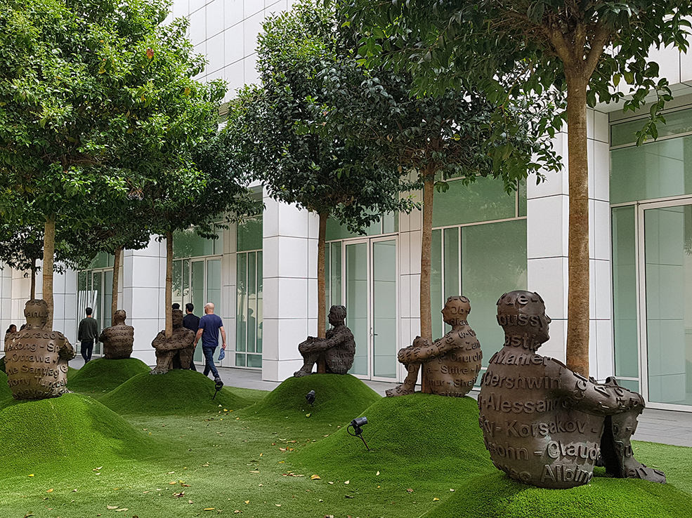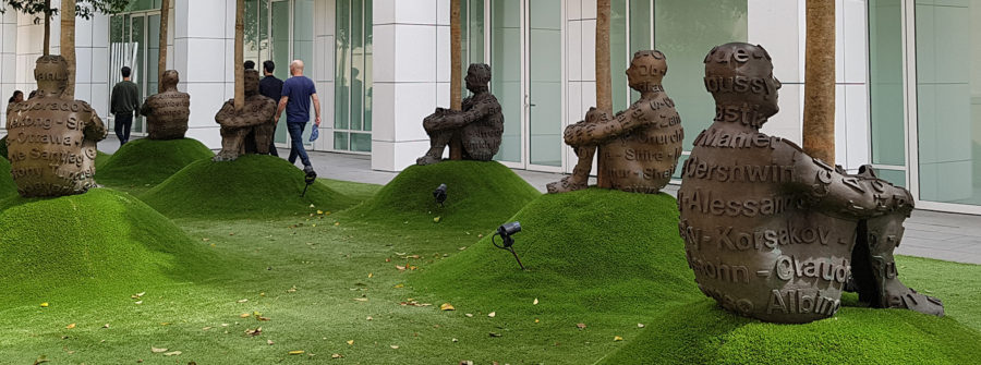 Soms zoekt Plensa de dialoog door gebruik te maken van het meest allerdagelijkste medium: tekst. Of symbolen, zoals het notenschrift. Mooi voorbeeld is The heart of rivers. Een werk dat je ook als een encyclopedie van Plensa’s beeldtaal kunt beschouwen: alles komt tezamen: de sereniteit van het menselijk, dromend gezicht, monumentaliteit, het nadrukkelijke claimen van de ruimte, symboliek en bovenal, de dialoog met de toeschouwer. The heart of rivers bestaat uit een aantal mannenfiguren in brons. Ze zitten op een heuvelachtig terreintje. Elke man omarmt een boom en droomt voor zich uit. Hun lichamen zijn bedekt met letters die woorden vormen. Bij de één zijn dat de namen van rivieren, een ander draagt de namen van componisten op zijn lijf. Dwalend door dat beeldenparkje word je uitgenodigd die woorden te lezen. De vragen komen dan vanzelf.