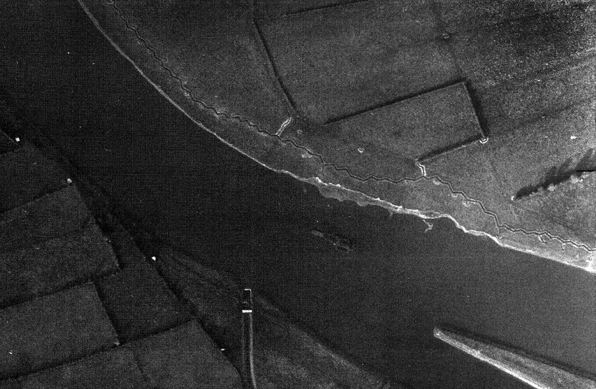 Bij de foto: Luchtfoto uit de oorlog van de Maasoever tussen Sambeek en Heijen waar Operation Wilforce plaatsvond. Aan de overkant zijn de Duitse loopgraven zichtbaar.