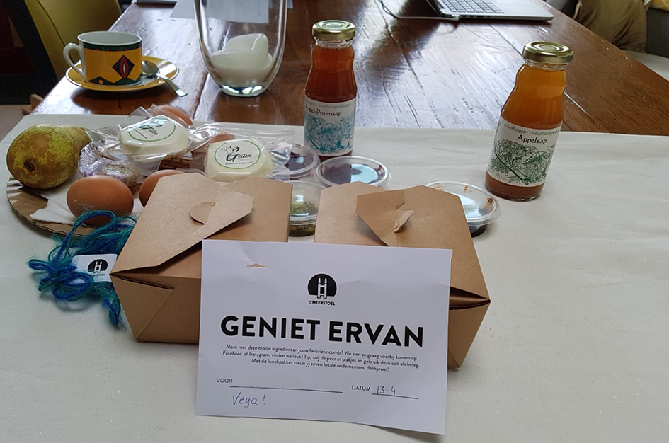 In grote steden, dacht ik, daar kun je zoiets wel organiseren. Niet in mijn dorp. Maar ik had het fout. Mijn lief vond het op Facebook: bij lunchroom De Meerstoel, van de Sambeekse stuw, kon je paaslunchpakketten ophalen. Verdomd. En zo zat ik tweede paasdag te smikkelen van geitenkaas uit de buurt en sapjes uit de Maasheggen. Even geen heimwee naar het pre-covidium.
