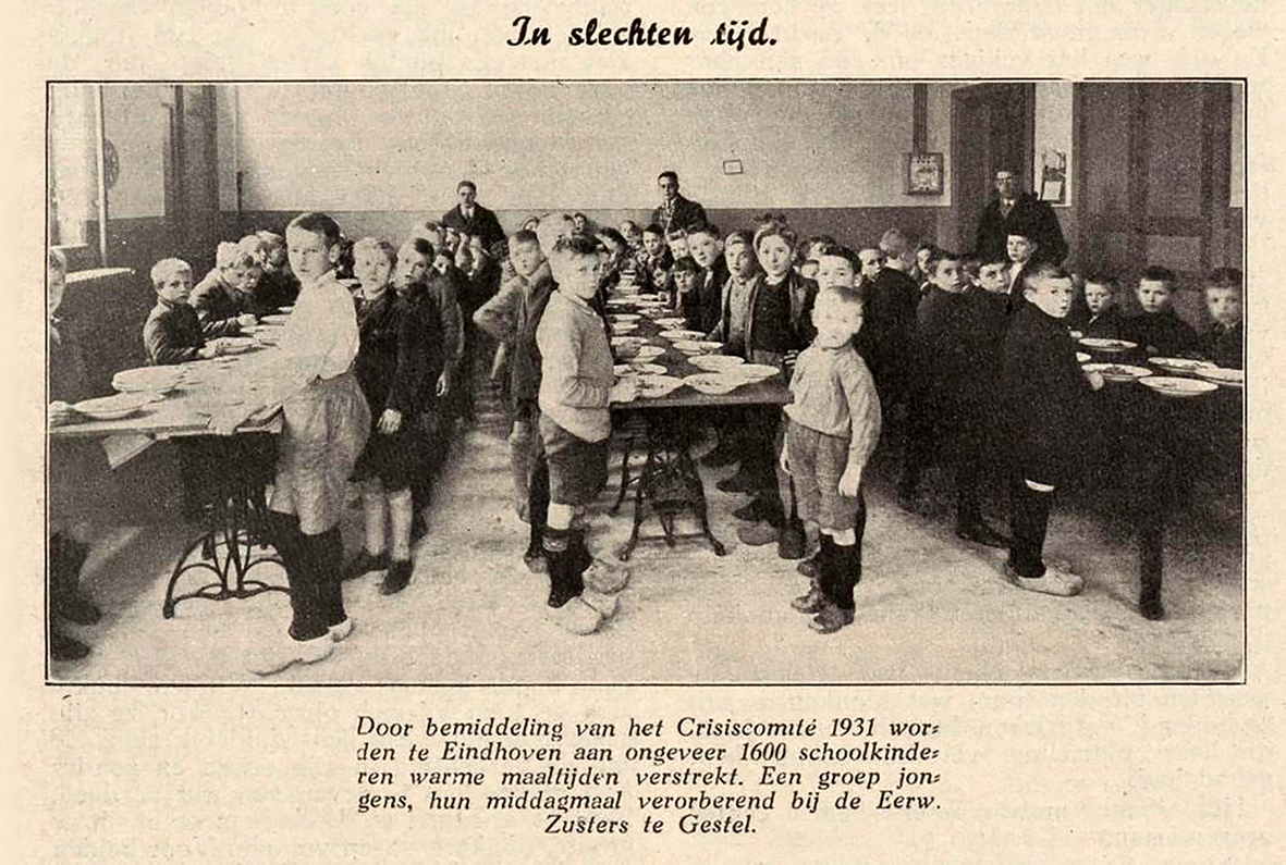 Bij de foto: Uitdelen van maaltijden in een schoolklas in Eindhoven. Bron: Nieuwe Tilburgsche Courant, 28 november 1931.